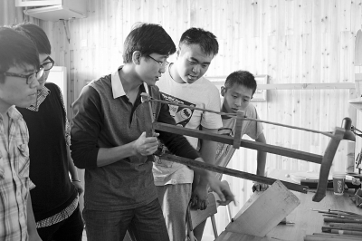 意大利籍提琴制作师刘朝阳(中间拿锯子者)指导学生对木材进行挑选和切割。