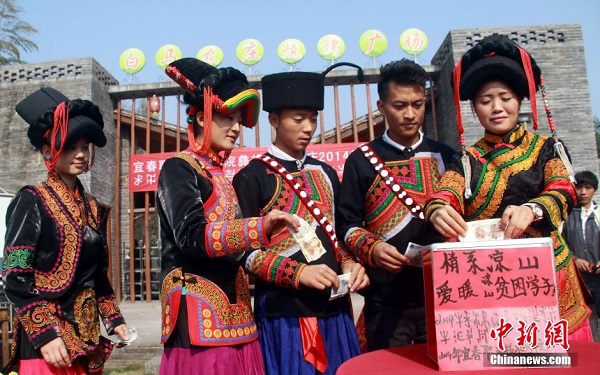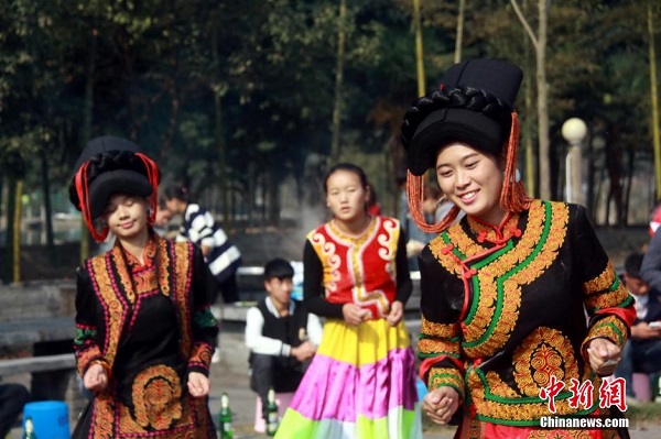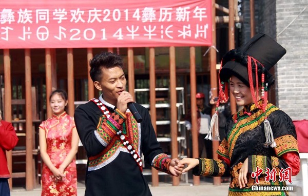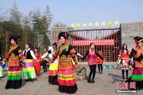 11月20日,江西宜春职业技术学院举行彝族同学欢庆2014彝历新年活动,65名来自四川大凉山的彝族学生欢唱敬酒歌,齐跳达体舞,现场制作彝族美食荞芭,吃砣砣肉,在异乡欢庆彝族年,并为大凉山贫困山区小学捐款。彝族除了传统的火把节,最盛大的节日就是彝族年,彝语称“库什”。11月20日,江西宜春职业技术学院彝族学生跳起欢快的舞蹈庆祝彝历新年。 邹海斌 摄