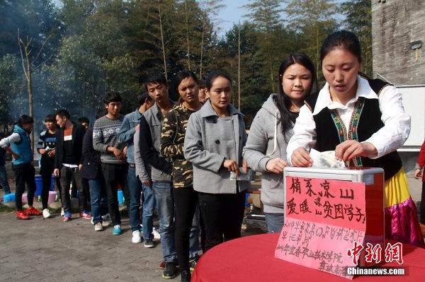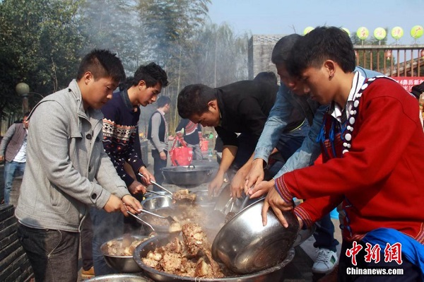 11月20日,江西宜春职业技术学院举行彝族同学欢庆2014彝历新年活动,65名来自四川大凉山的彝族学生欢唱敬酒歌,齐跳达体舞,现场制作彝族美食荞芭,吃砣砣肉,在异乡欢庆彝族年,并为大凉山贫困山区小学捐款。彝族除了传统的火把节,最盛大的节日就是彝族年,彝语称“库什”。11月20日,江西宜春职业技术学院彝族学生分享砣砣肉。 邹海斌 摄