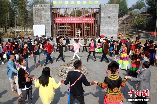 11月20日,江西宜春职业技术学院举行彝族同学欢庆2014彝历新年活动,65名来自四川大凉山的彝族学生欢唱敬酒歌,齐跳达体舞,现场制作彝族美食荞芭,吃砣砣肉,在异乡欢庆彝族年,并为大凉山贫困山区小学捐款。彝族除了传统的火把节,最盛大的节日就是彝族年,彝语称“库什”。图为11月20日,江西宜春职业技术学院彝族学生和老师载歌载舞欢庆彝历新年。 邹海斌 摄