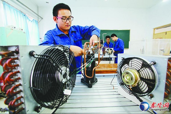 11月3日,利津县职教中心学生在制冷与空调实训室进行空调组装与检修训练。