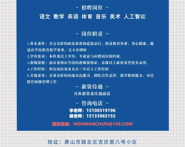 共选聘事业编制教师6名,详见《唐山高新区2025年选聘事业编制教师岗位信息表》(附件1)。学科岗位之间可根据报名情况、考试结果适当调剂。