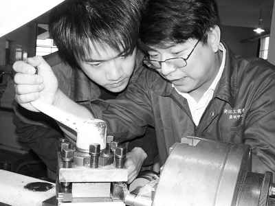学校开展“首席工人、技术能手带徒工程”,图为宁波首席工人指导学生操作。