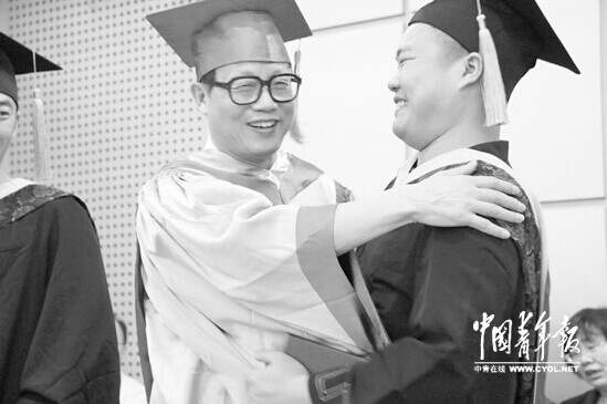 汽车学院毕业生罗章(右)给了院长万由祥一个大大的拥抱。本报记者 谢湘摄