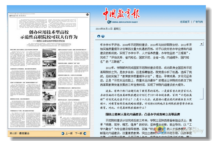 6月11日出版的《中国教育报》以《创办应用技术型高校,示范性高职院校可以大有作为——陕西工业职业技术学院办学纪实》为题,6月27日出版的《中国青年报》以《厚积薄发千帆竞,示范高职育英才——陕西工业职业技术学院内涵发展之路》为题,分别刊发了整版图文,全景式回顾了学院自2010年来的发展建设历程,科学回答了在推进现代职教体系建设中,国家示范高职院校该向何处去的命题。