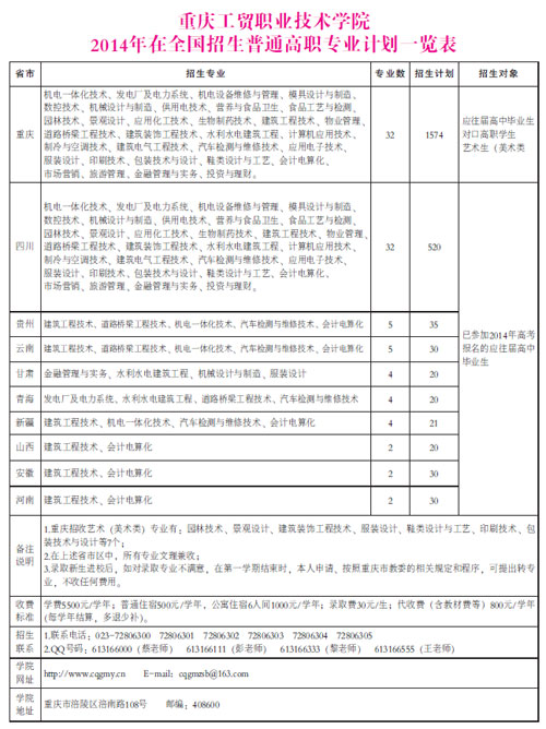 我院2014年面向重庆、四川、云南、贵州、青海、甘肃、新疆、安徽、河南、山西等10个省份(市、自治区)招收高中毕业生。在重庆市外,按照专科层次的分数线录取;在重庆内有18个专业纳入高职专科一批、14个专业纳入高职专科二批录取,同时还招收对口高职、艺术(美术)类的考生。