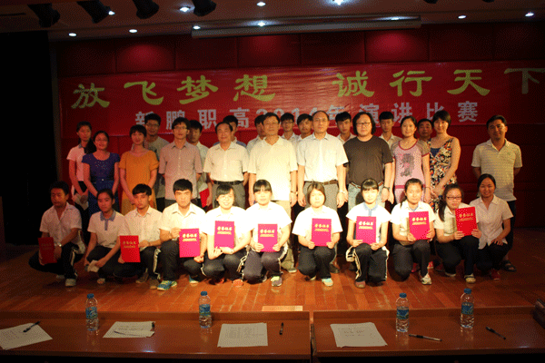 2014年6月9日下午新鹏职高全体师生在行政四楼举办了主题为“放飞梦想·诚行天下”演讲比赛。本次比赛由新闻职高部德育组老师组织,在各班班主任的推荐和部里彩排选拔后,有13名选手进入决赛。比赛中,学生结合自己工学交替的学习经历,讲工作中的诚信之重要,谈自己的梦想和未来。经过评委老师的选定,最终酒管20131班的王丽同学获得一等奖,汽修20111班刘柯、20131班的安茂粼获得二等奖。比赛后殷刚校长做了点评,肯定了同学们的优秀表现,也希望今后多多参与这些活动。