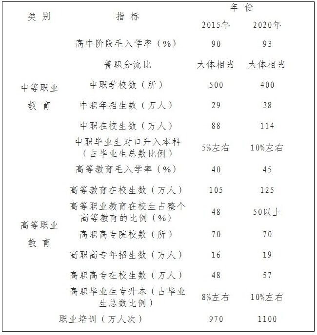 ——到2015年,初步形成具有湖南特色的现代职业教育体系。现代职业教育理念得到广泛认同,系统化人才培养观念被人们普遍接受,对接产业、服务地方的空间布局基本形成,技术技能人才培养体系初步构建,技术技能人才成长“立交桥”初步搭建,现代职业教育制度基本完善,职业教育服务区域经济社会发展和产业转型升级能力明显提升。