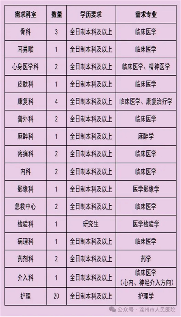 近年来,随着新技术、新项目开展、业务量的逐年增加以及人民群众就医需求的不断提高,为适应医院发展需求,更好地为广大患者服务,滦州市人民医院特面向全社会广纳贤才,2024年度拟招聘临床医疗、医技、药剂、护理等专业技术人员46人。招聘的具体专业和数量见下列附表。