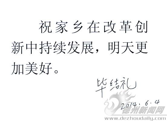 由于毕结礼工作繁忙、时间紧张,采访当天,他未能为家乡题词。第二天,他特意发来传真,内容为:“祝家乡在改革创新中持续发展,明天更加美好。”