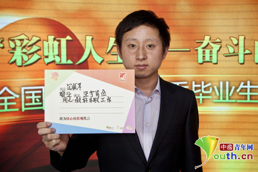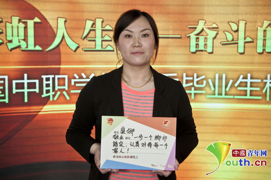 “彩虹人生——奋斗的青春最美丽”分享团成员,天津津利华酒店服务员裴娜写下自己的“价值观体”。