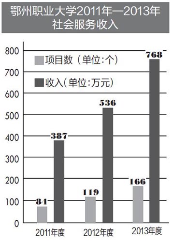 与此同时,鄂州职业大学将社会服务作为赢得鄂州市政府支持的重要支点,以服务为宗旨,以服务求支持。鄂州市是湖北省经济社会综合改革试点城市,学校成立鄂州市经济社会改革发展研究中心,有针对性地开展相关研究,累计完成市发改委委托的调研课题30项;学校整合全市的职业教育与培训资源,在技术服务、社会培训、项目研发等方面的社会服务收益近3年累计达到1690万元。优质的社会服务带来的不仅仅是直接的经济效益,更多的是鄂州市政府及相关职能部门的政策支持,使得学校的办学环境进一步优化。
